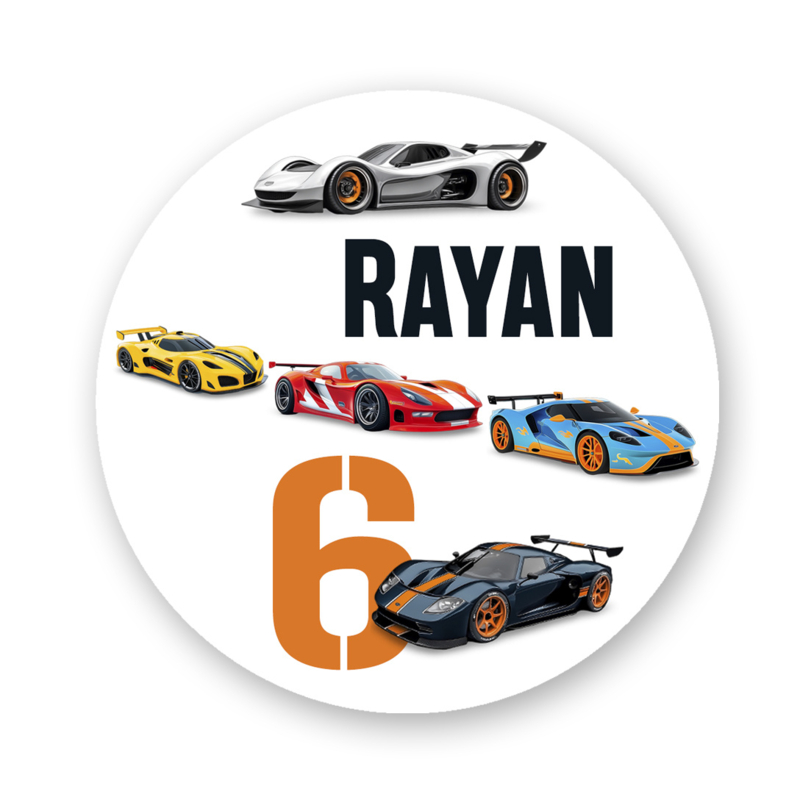 Maak van elke traktatie een stoer feestje met deze gepersonaliseerde auto traktatiestickers! Perfect voor jonge autoliefhebbers die hun verjaardag in stijl willen vieren. De stickers worden bedrukt met naam en leeftijd (zoals Rayan 6) en hebben een opvallend design met sportauto’s en frisse kleuren.